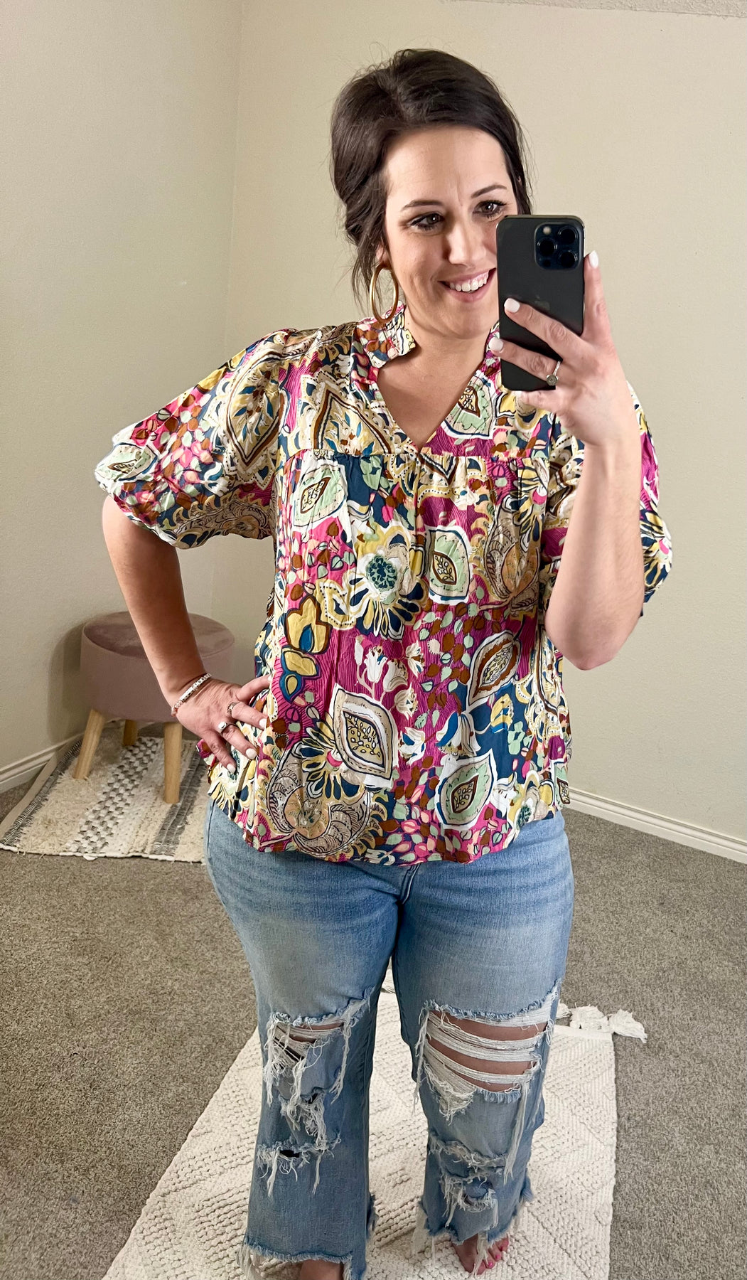 The Wanderlust Blouse is a beautifully crafted mixed-print top that captures a spirit of adventure and elegance. In a palette of soft pinks with accents of mustard, sage, and tan, this blouse features a unique split neckline and charming short puff sleeves for a feminine silhouette. Made from 100% rayon, it offers a lightweight and airy feel, perfect for a casual day out or an evening gathering. Pair it with your favorite color shorts this summer — you could really pull any colors out of this one!
